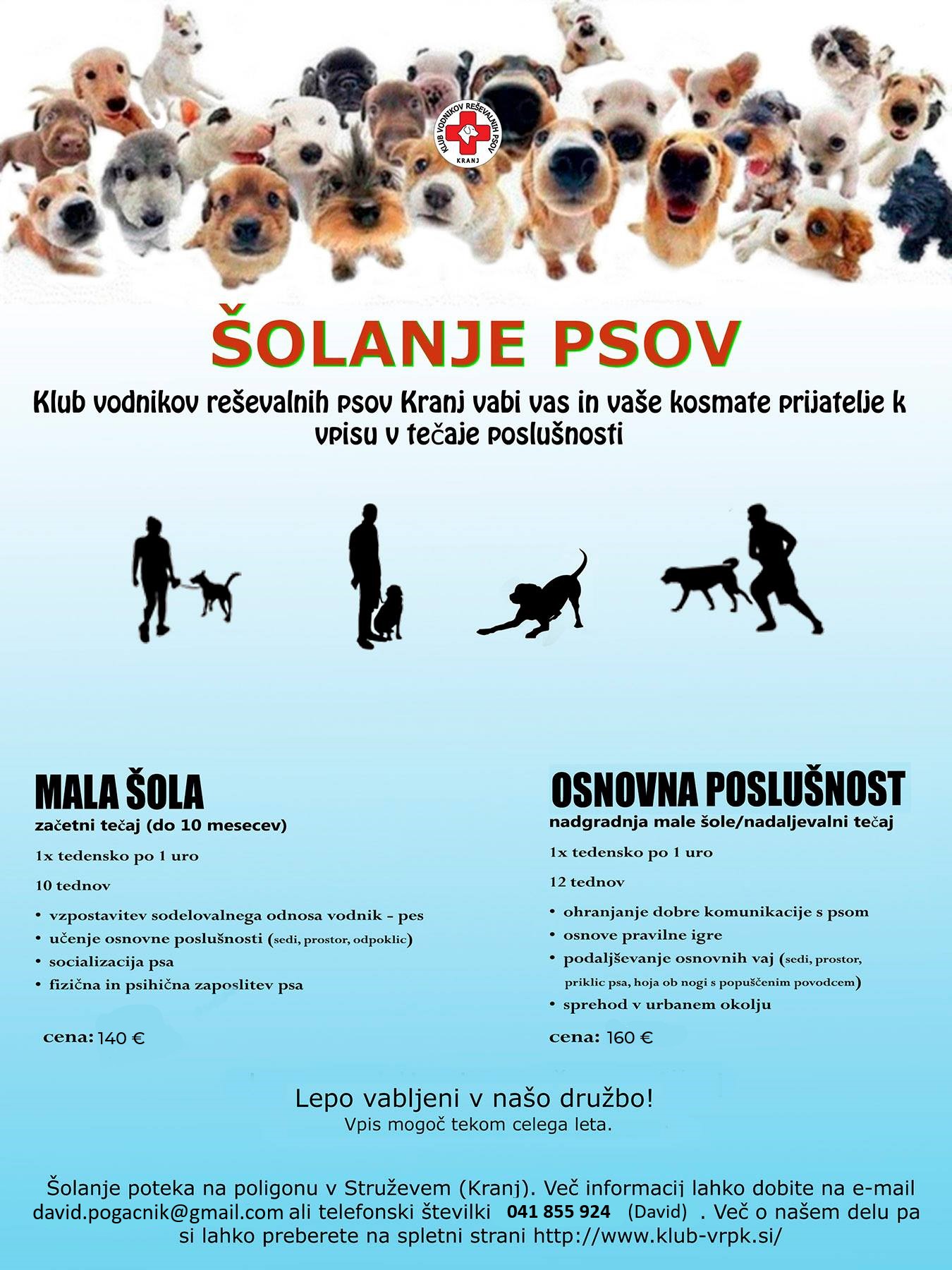 Še teden dni nas loči do ponovnega začetka šolskega leta. S tem pa tudi v KVRP Kranj pričnemo z vpisom v pasjo šolo. Vabimo vas da se nam pridružite v Struževem, na poligonu kluba vodnikov reševalnih posv Kranj, kjer bomo skupaj naredili ta korak. V naši ponudbi sta programa: mala šola ter osnovno šolanje. V mali šoli se boste naučili vzpostaviti sodelovalen odnos vodnik - pes, osnovne ukaze, socializacijo psa ter psiho - fizično zaposlitev psa. V osnovnem šolanju boste to znanje z vašim psom še nadgradili.